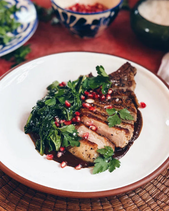 The barely wilted garlicky greens and pop of bright pomegranate perfectly compliment the juicy pork chop and our chili forward Mole Rojo.